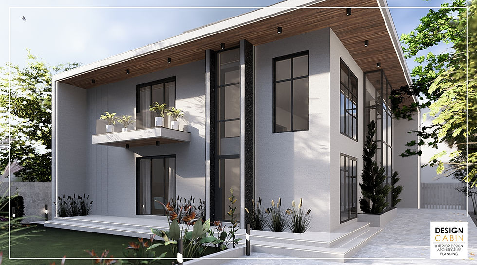 The upper-level balcony, enclosed by chic wooden railings, offers a stylish outdoor retreat. The grand entrance, with tall glass doors flanked by sidelights, makes a bold and welcoming impression. Supported by robust wooden pillars, the overhanging section adds architectural drama and flair.